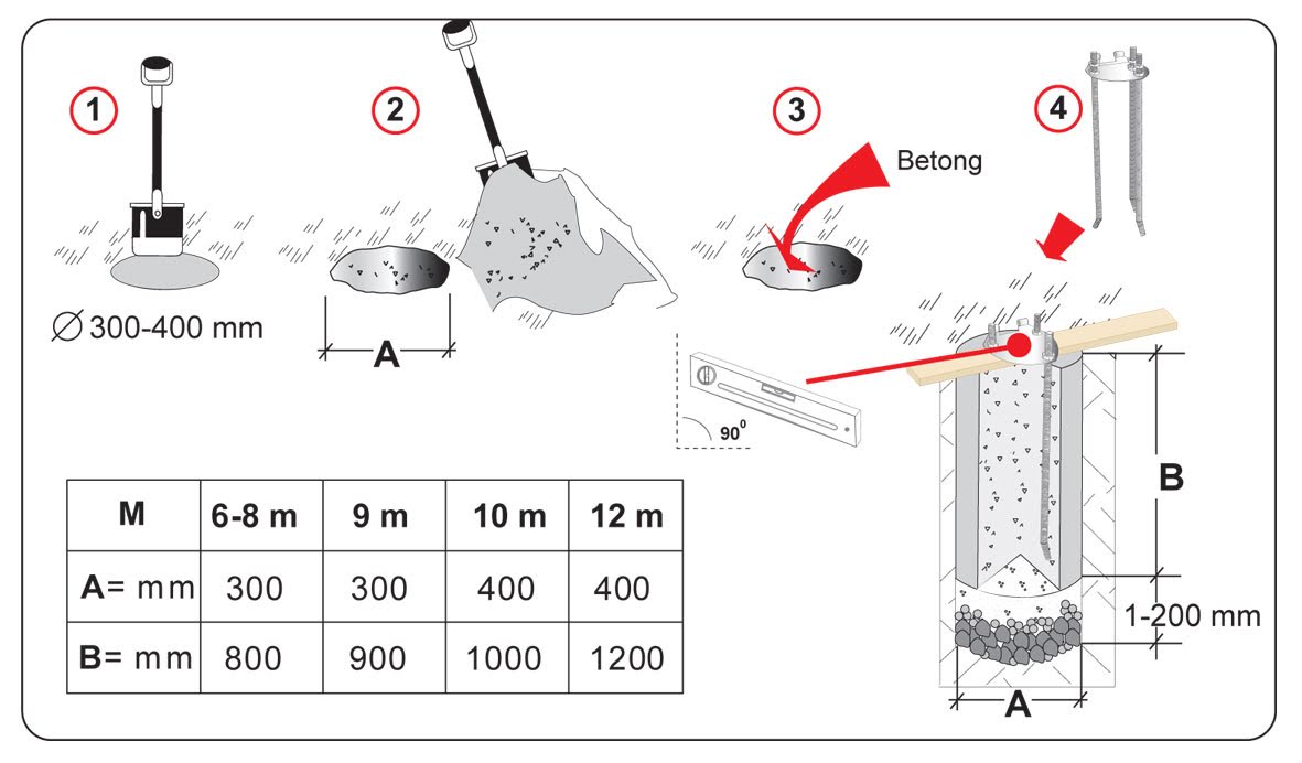 - Gräv en grop, bredd och djup beroende på flaggstångens längd, enligt tabellen på bilden ovan.