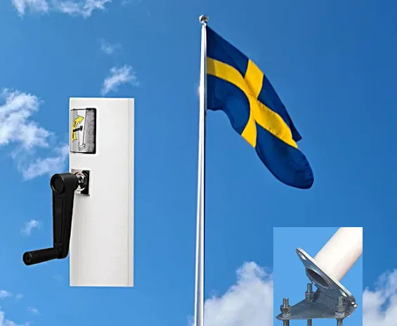 Flaggstång med vinsch levereras komplett med roterbar kula, lina, rostfri karbinhake, vev, viktring samt vevmekanism.